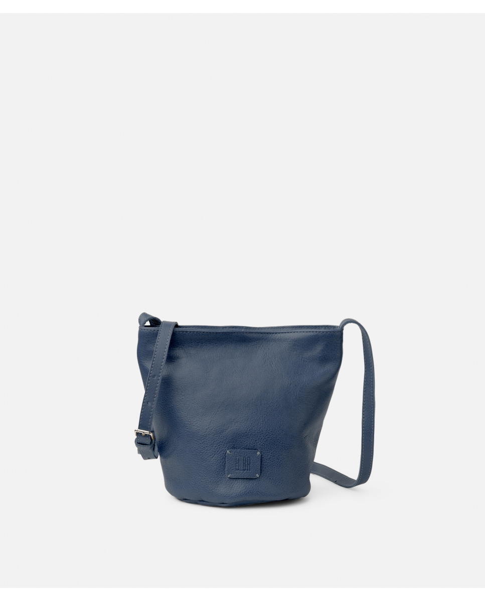Bolso bandolera de piel vacuna. Formato cubo, bandolera ajustable, cierre con cremallera, bolsillos internos, y forro de algodón.