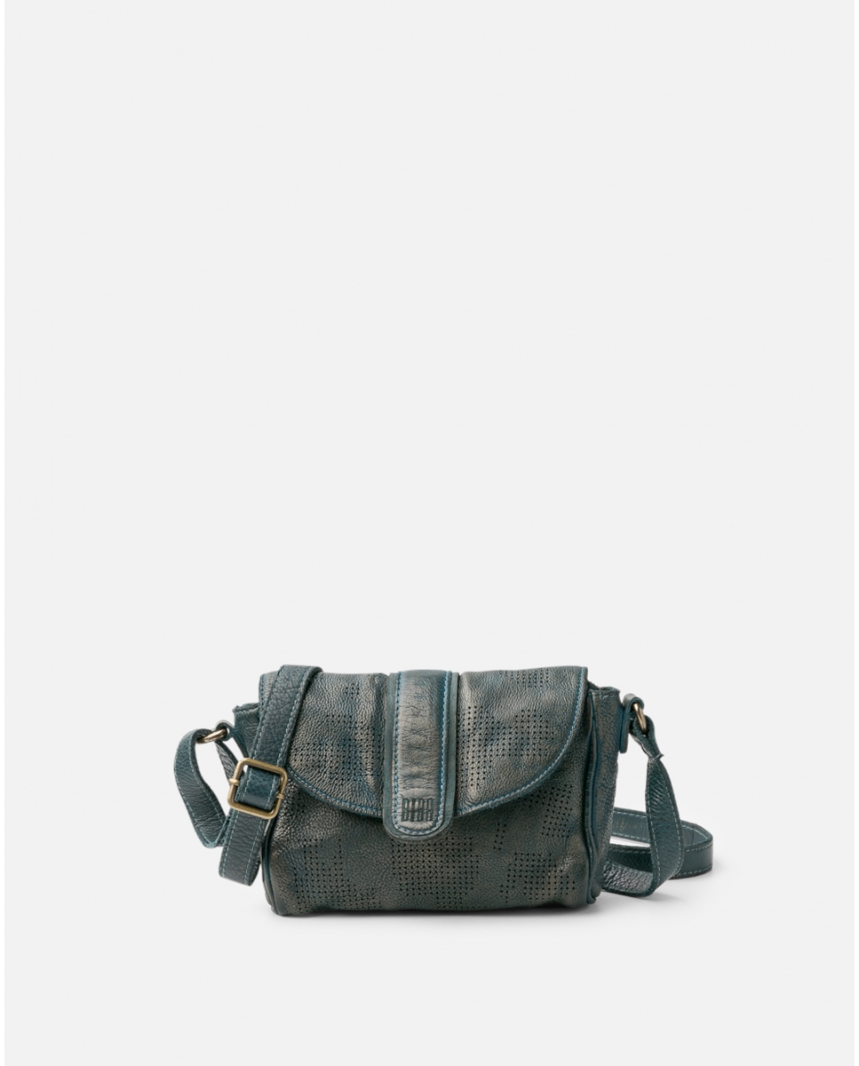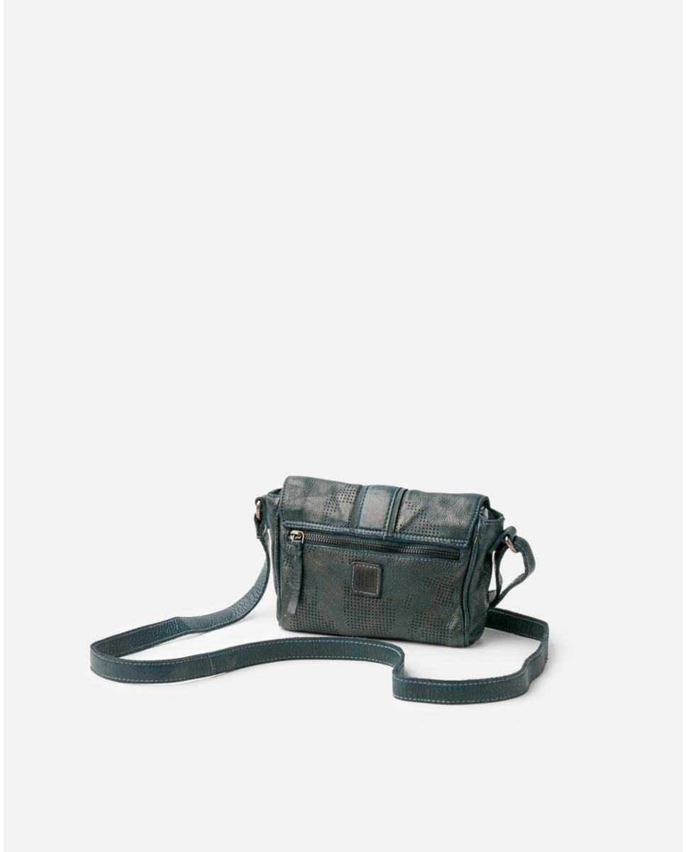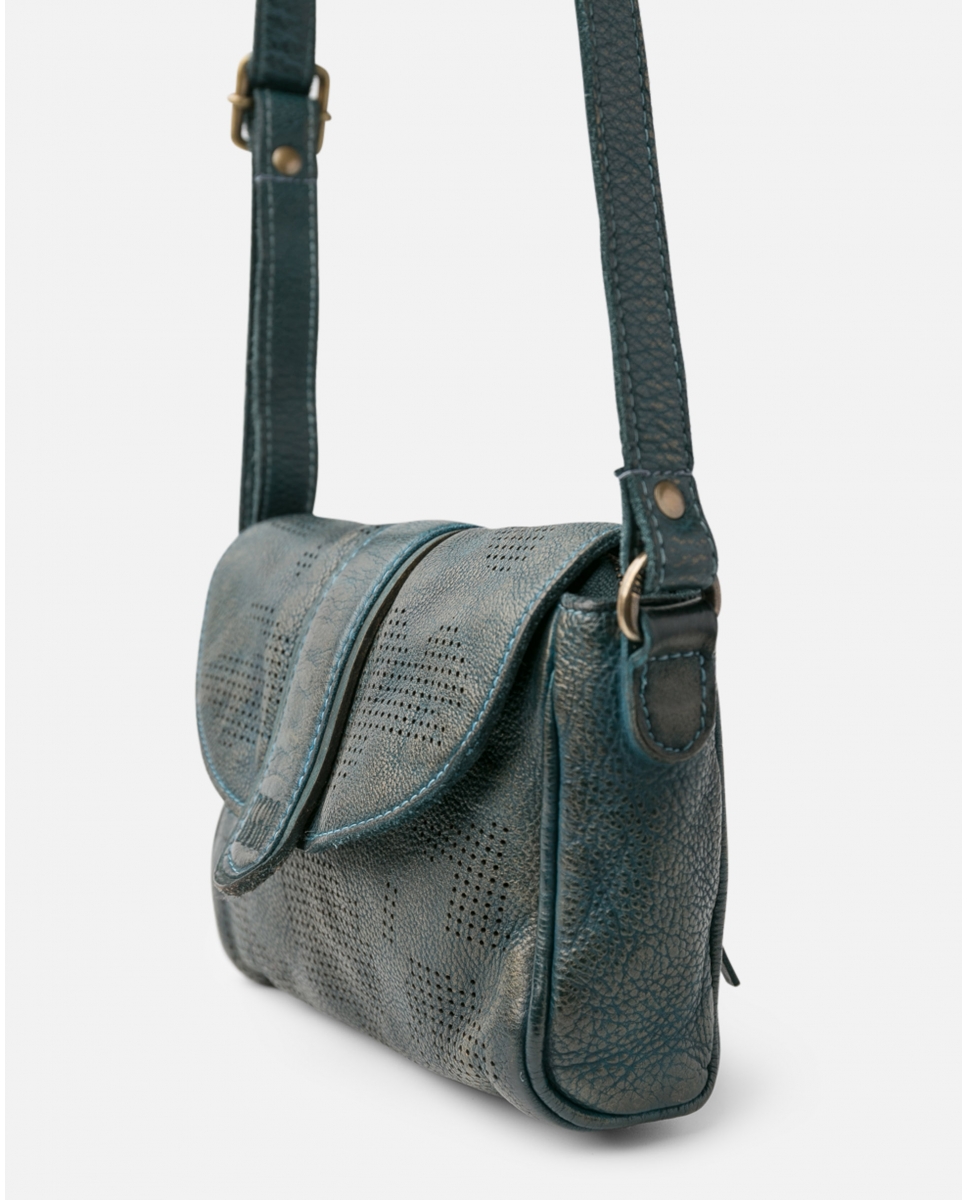 Bandolera pequeña de piel vacuna lavada, troquelada, y con efecto perlado. Cierre con solapa y cremallera. Bandolera regulable. Bolsillos externos e internos. Forro de algodón.