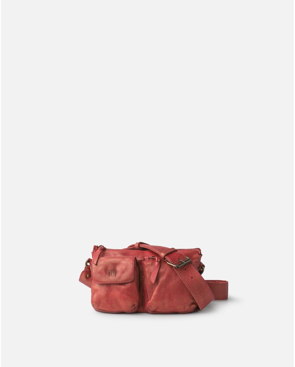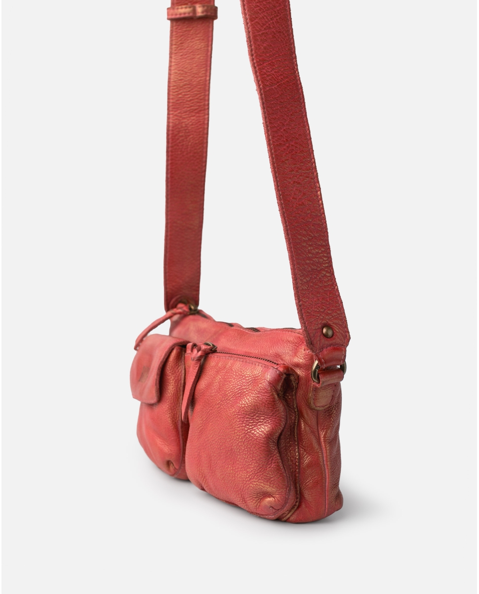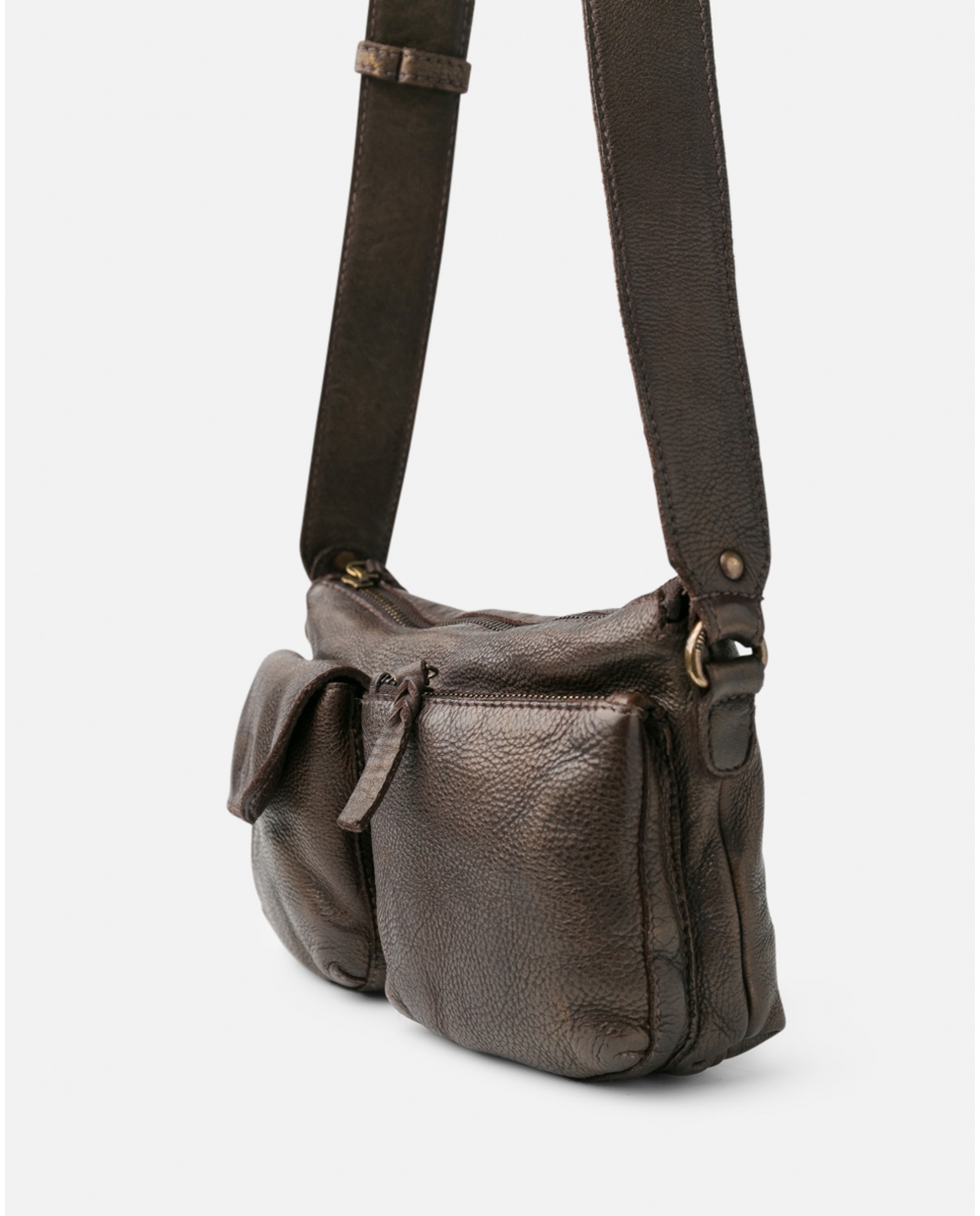 Bolso bandolera de piel vacuna lavada, efecto perlado. Cierre con cremallera, bandolera regulable, multiples bolsillos externos e internos, y forro de algodón.