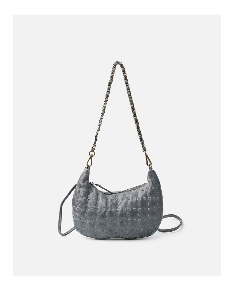 Hobo pequeño formato gondola de piel vacuna lavada. Ligeramente acolchado, y decorativo frontal de pespuntes en hilo grueso. Asa de hombro de cadena y piel extraíble. Cierre con cremallera. Bandolera regulable y extraible. Bolsillos externos e internos. Forro de algodón.