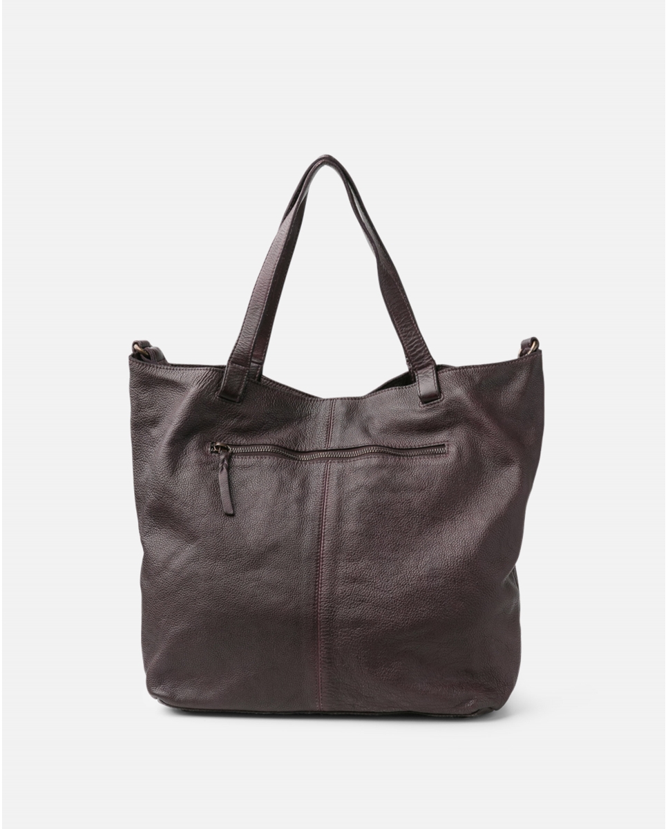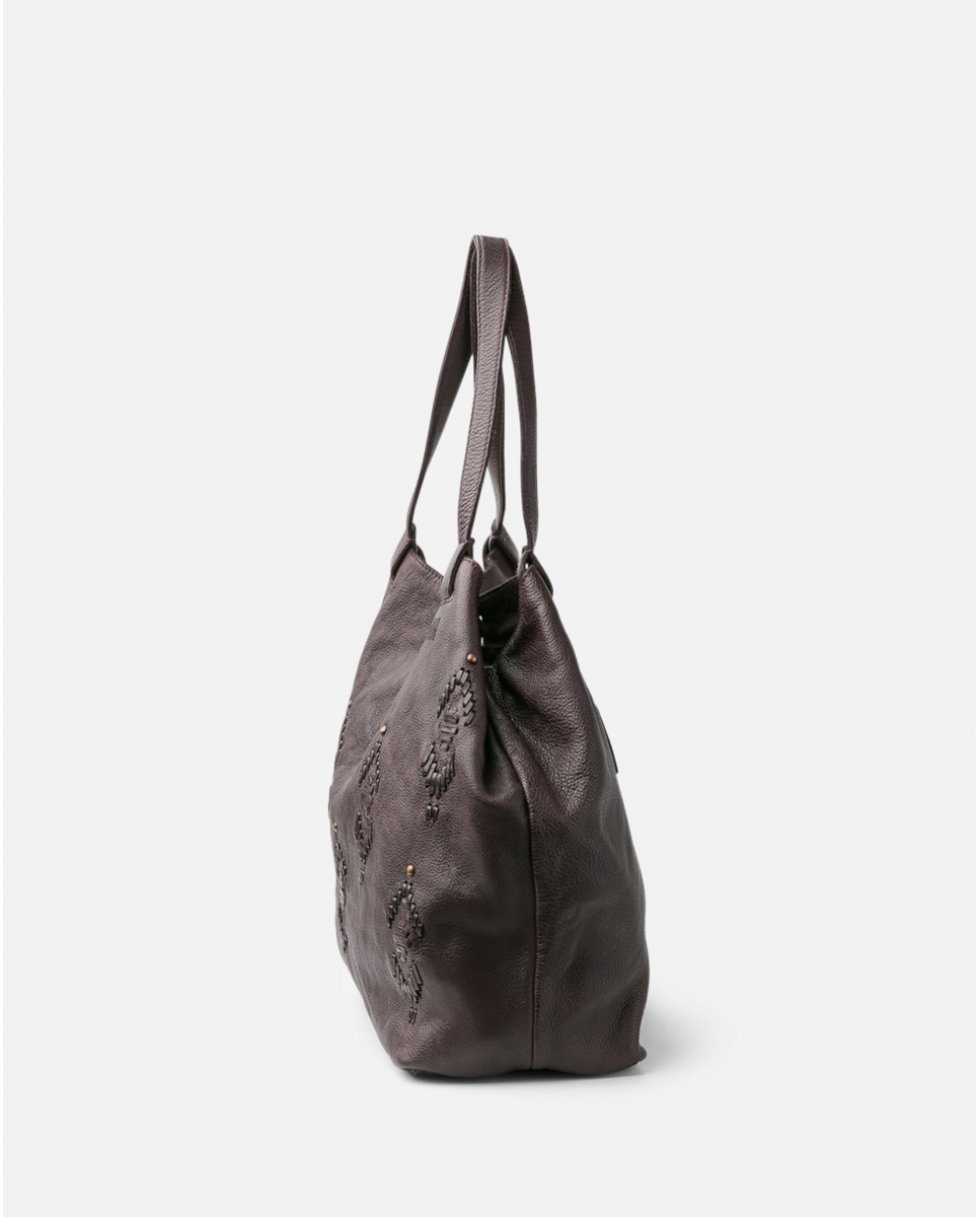 Shopper de piel vacuna lavada. Tachuelas y pespuntes frontales de piel con motivos tribales. Cierre con boton central, y correa y aro laterales que permiten modificar y cerrar la boca del bolso. Bolsillos externos e internos. Forro de algodón.