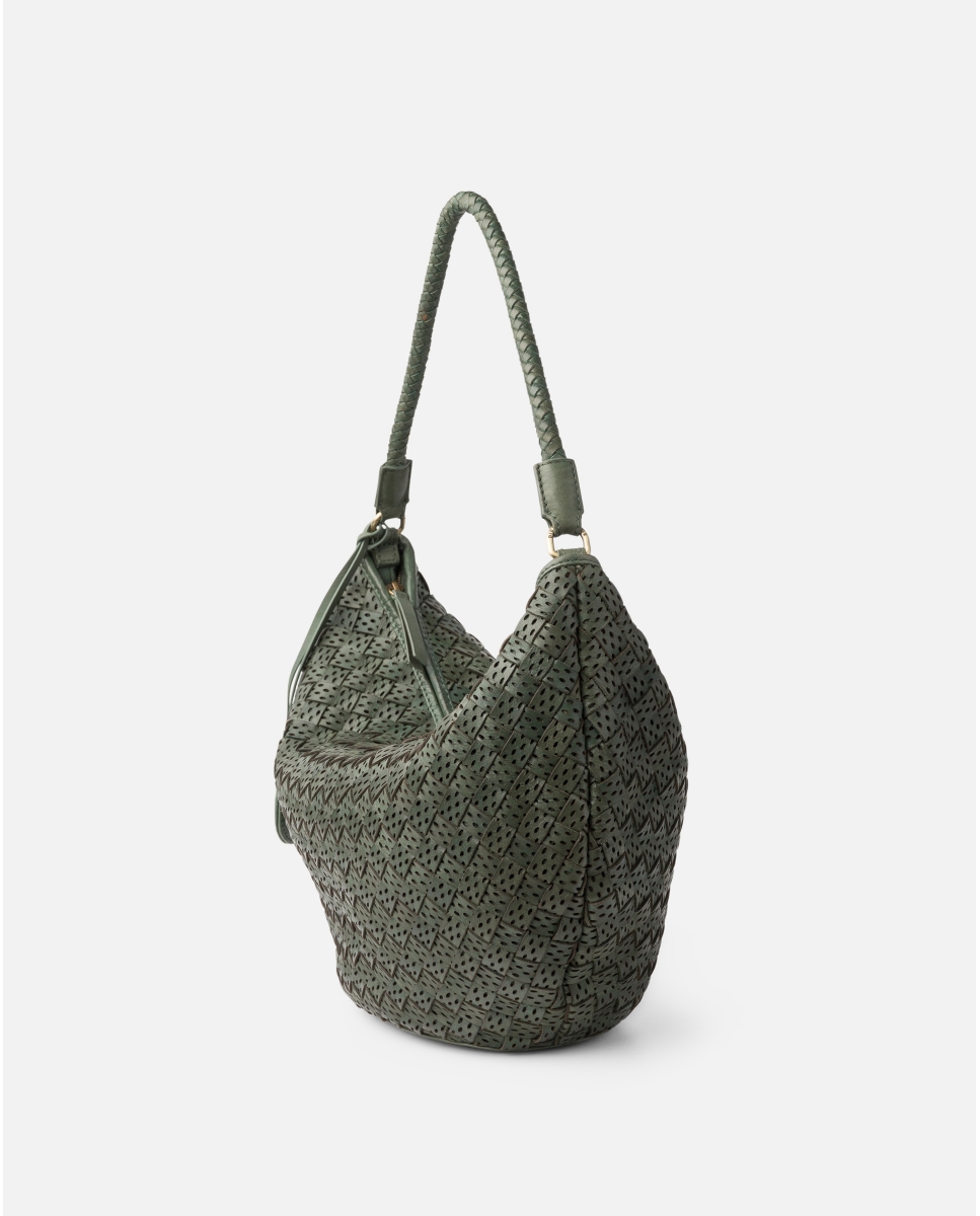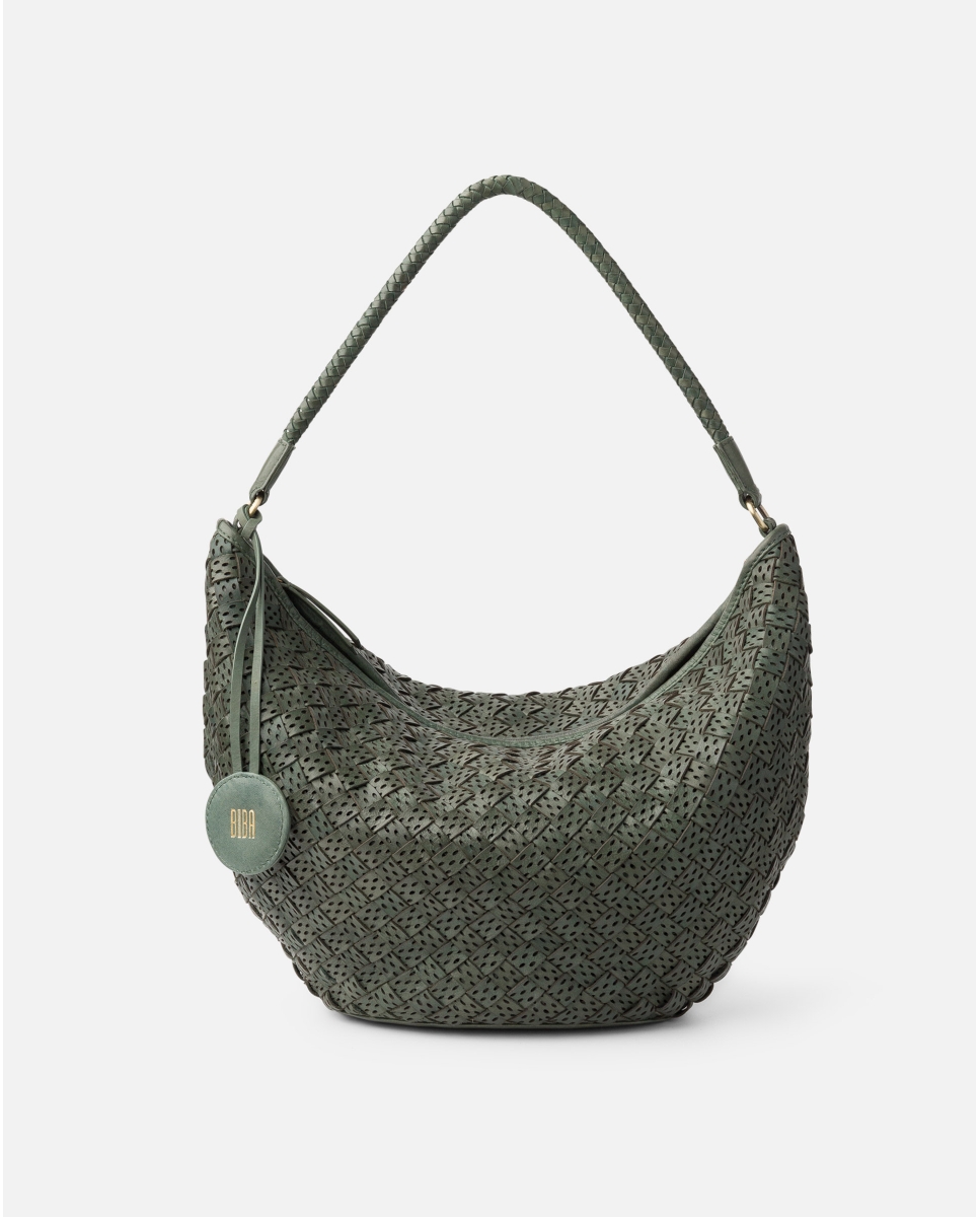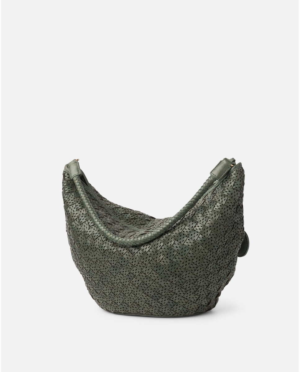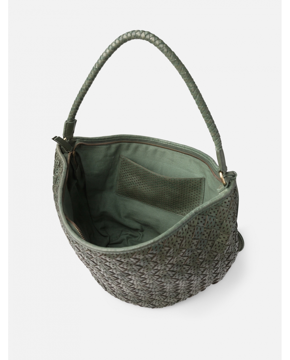 Hobo mediano de piel vacuna lavada, trenzada y troquelada. Asa de hombro. Cierre con cremallera. Bolsillos internos. Forro de algodón.
