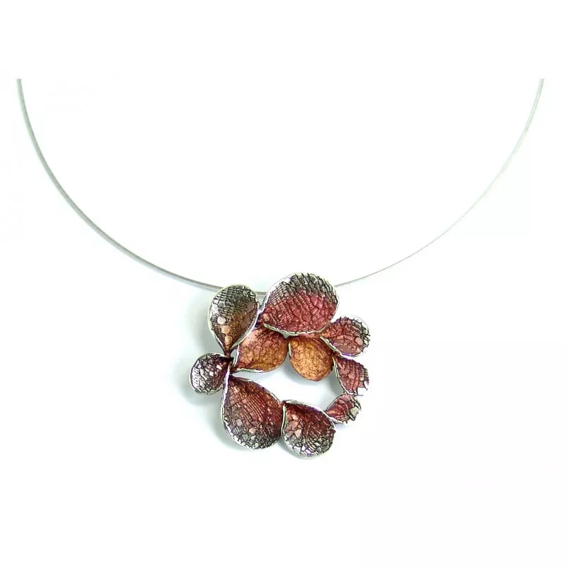 Este colgante de diseño artesanal en plata de ley 925 presenta un círculo de forma irregular decorado con delicados pétalos. La pieza tiene un acabado en óxido, realzado con pigmentos metálicos en tonos azulados que aportan un toque de color y profundidad. Una joya única y elegante, pensada para quienes buscan una pieza que combine distinción y estilo eterno.
